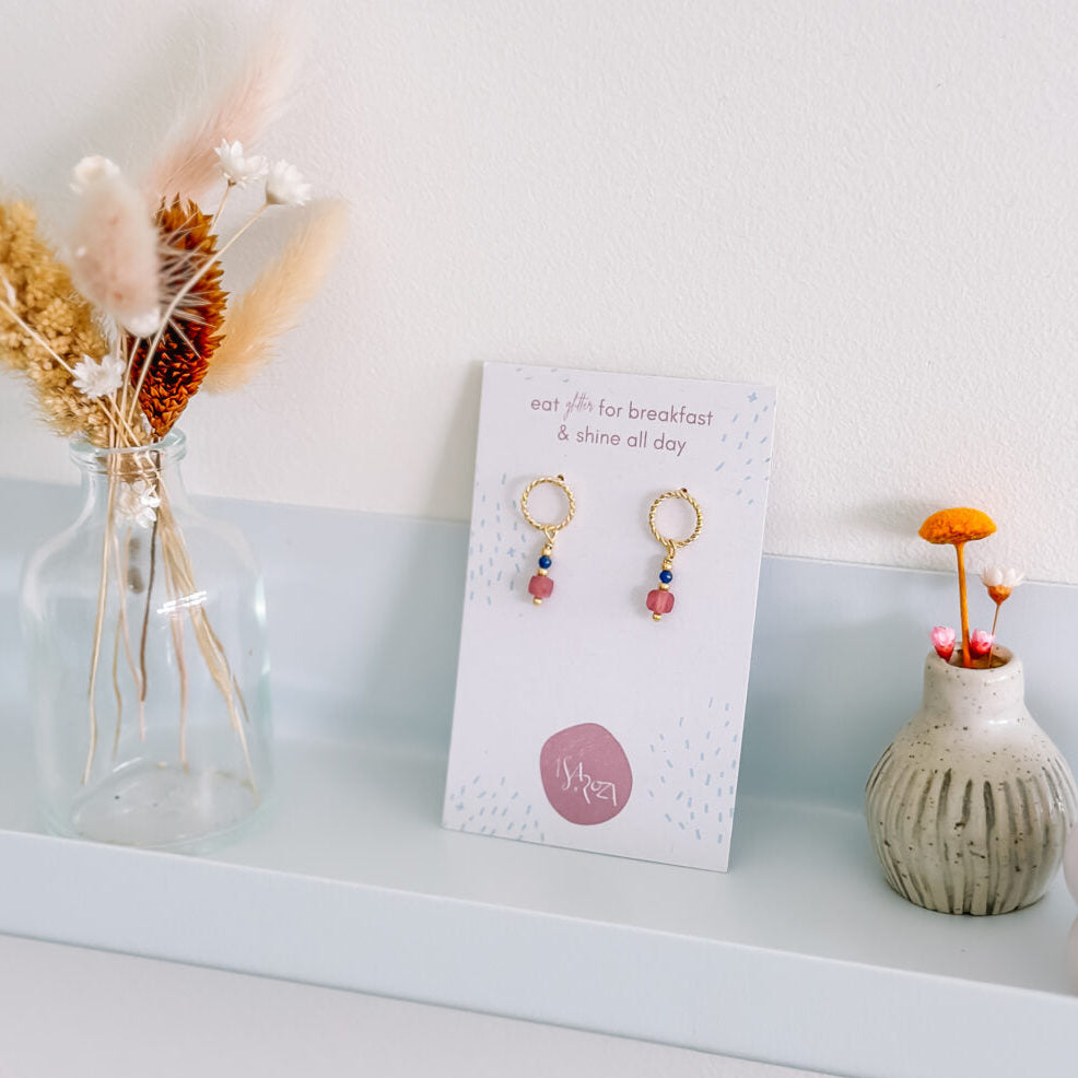 Isa & roza : Getorste ronde oorsteker met warmroze en donkerblauwe halfedelsteentjes €