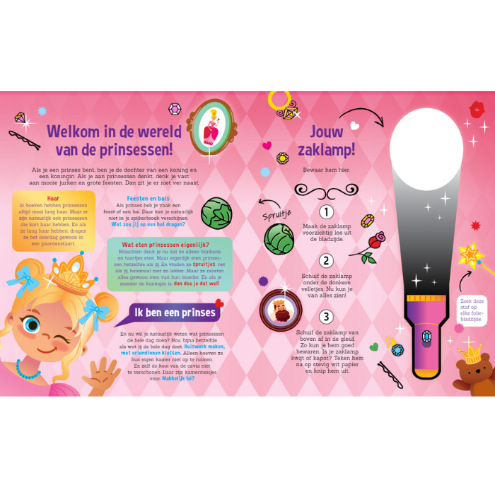 Prinses Sofie heeft aan kast vol met prachtige jurken. Haar lievelingsjurk is bezaaid met glinsterende diamantjes, pareltjes en rozen. Die draagt ze alleen als er in het paleis een groot feest is. Maar dan lijkt er iets aan de hand te zijn met haar mooiste jurk. Als dat maar weer goed komt! Het boek begint met leuke weetjes en feitjes over prinsessen. Hier kom je ook de kartonnen zaklamp tegen. Deze zaklamp heb je nodig voor de pagina's die volgen. In het verhaal staan namelijk gekleurde woorden, die je op de rechterpagina kunt zoeken. Maar dat lukt alleen als je de zaklamp gebruikt! Schuif 'm onder de zwarte pagina en je ziet dat er een lichtbundel ontstaat, waarmee je kunt zien wat Sofie allemaal beleeft. Bekijk je ook de andere titels in deze serie?
