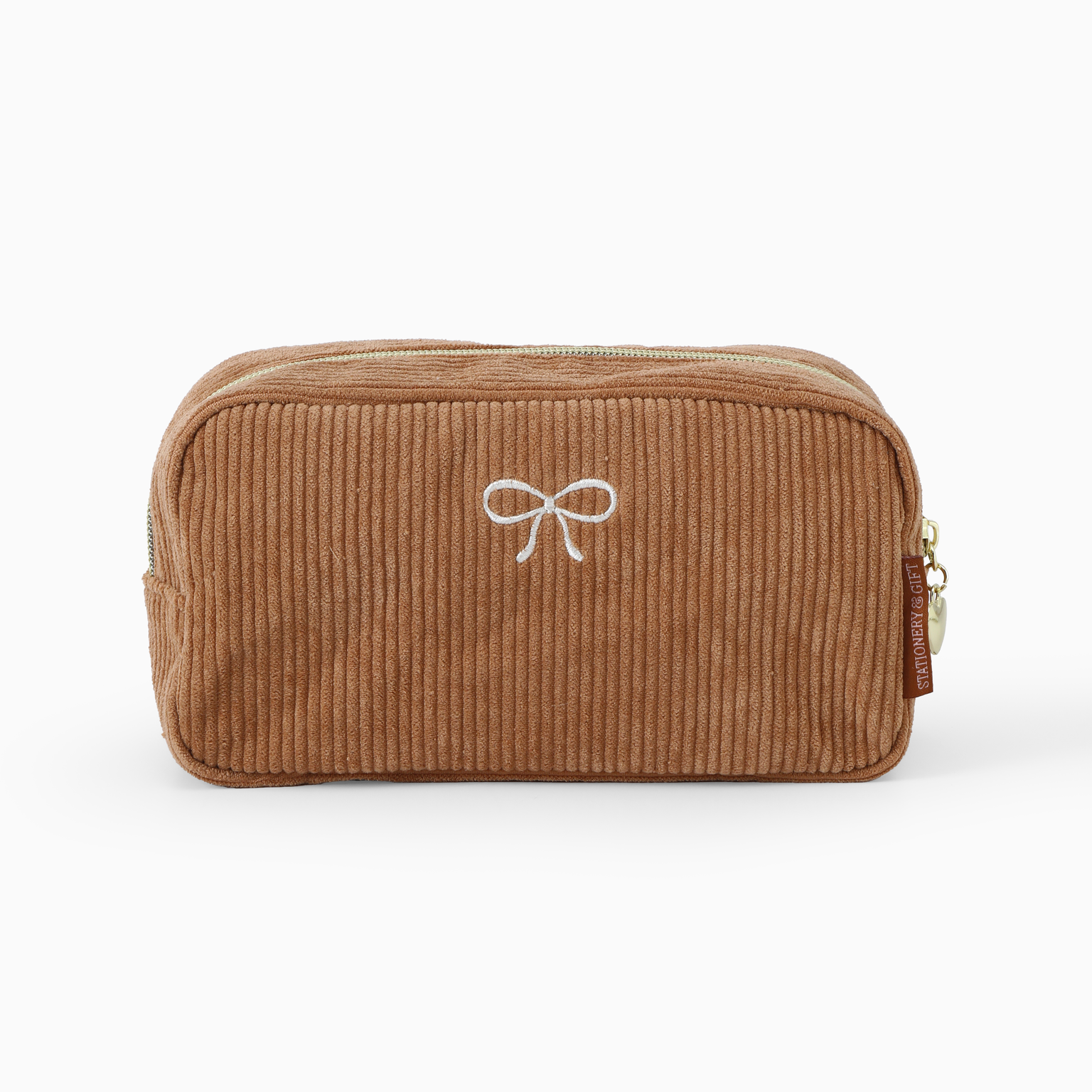 Een geborduurd strikje in creme aan de voorkant en de achterkant met aan de rits een gouden hartje. Wij vinden dit zo ontzettend schattig!